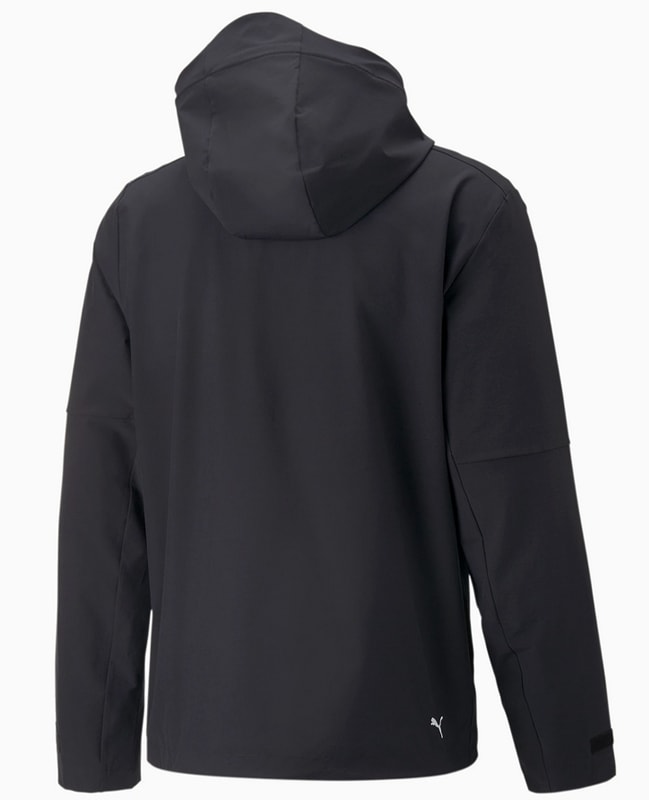雨から保護するためのシェル生地は撥水コーティングがされています。また裏地はPUMAテクニカルマテリアル構造、蒸れを防ぐためメッシュ生地になっています。生地は伸縮性があり突っ張る感じがあまりないのでスポーウェアとしてもオススメです。