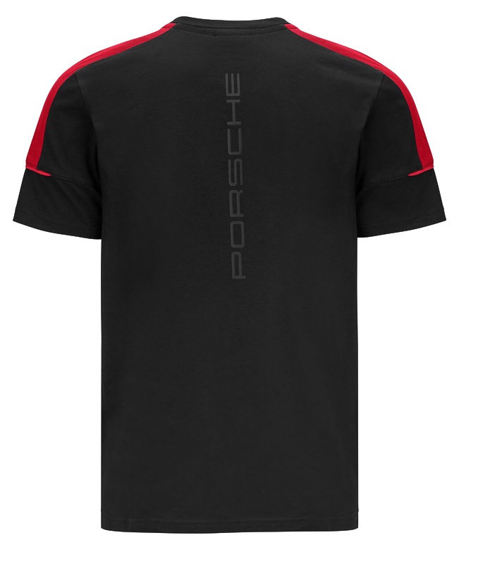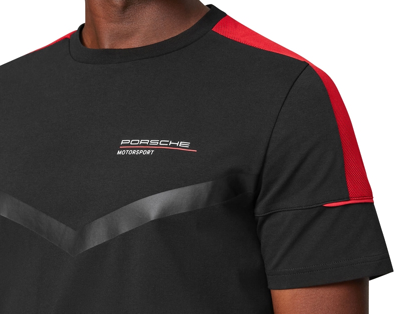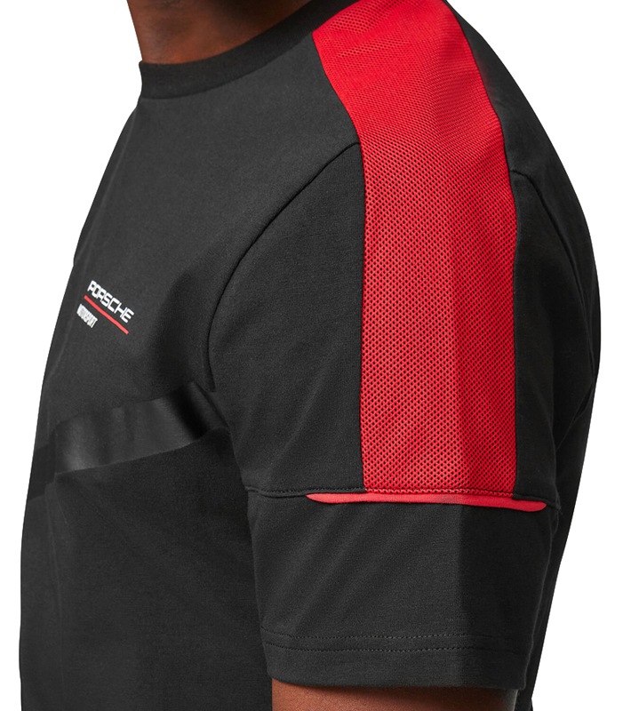 フロントにポルシェモータースポーツのロゴと背面にポルシェロゴがプリントされています。 肩から袖かけて赤のメッシュインサートがアクセントを利かせています。