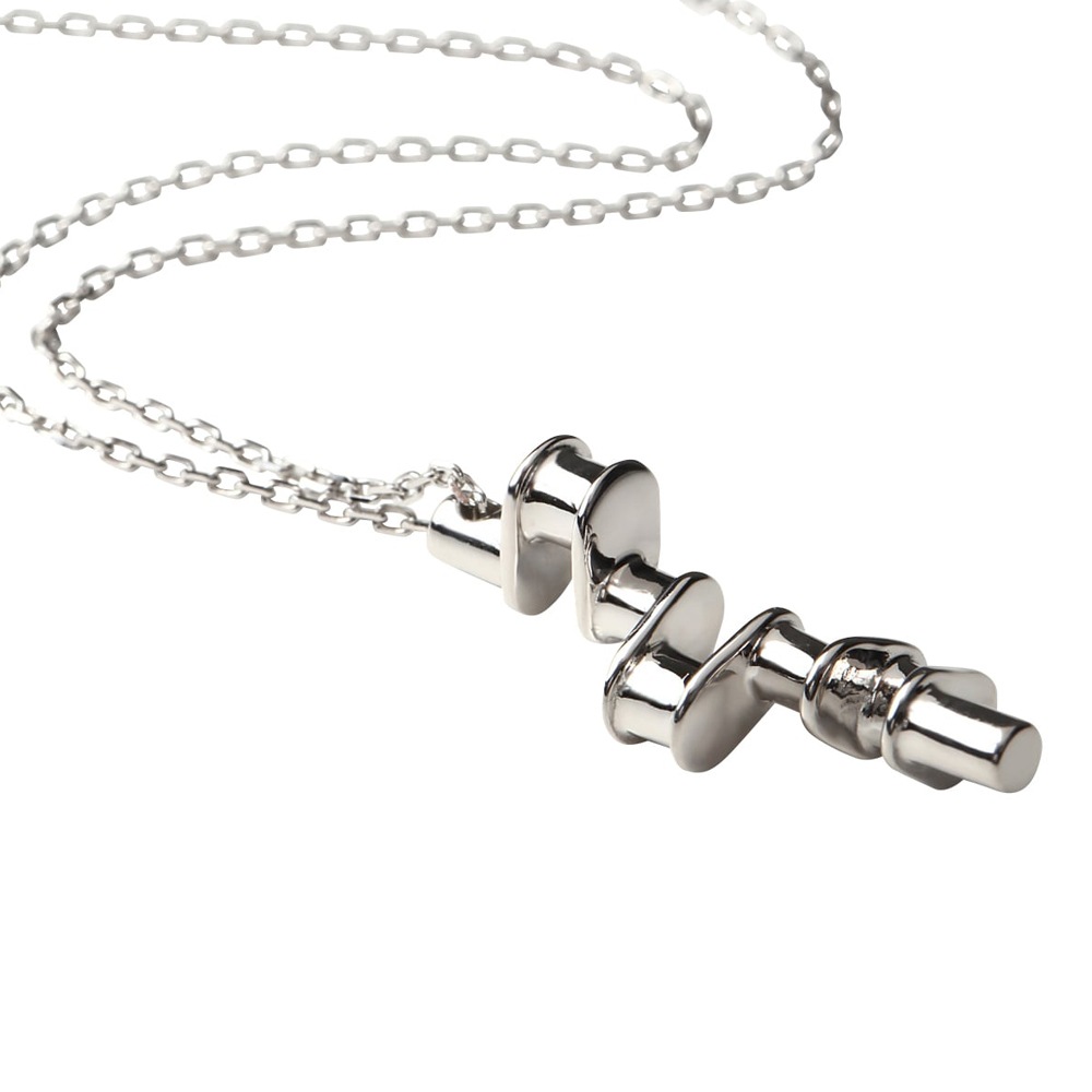 エンジンルーム、シリンダー室の爆発力によって縦運動しているピストン、コンロッドをを回転運動に変える部品「クランクシャフト」 そのクランクシャフトをモチーフにしたペンダントネックレスです。