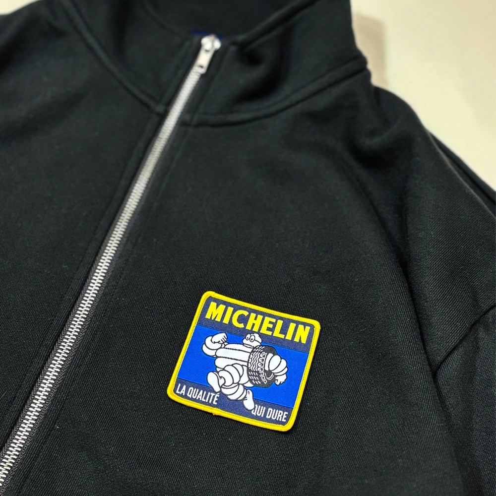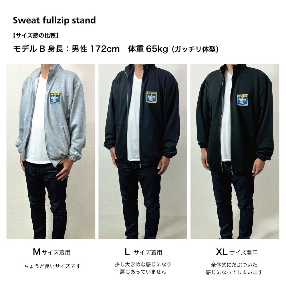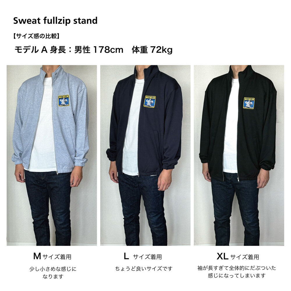 ミシュランカラーのワッペンがアクセントとして効いている フルジップアップのスウェットです。 季節の変わり目に、羽織としてはもちろんコートのインナーとしても使えるアイテムです。 フルジップスタンド、クルーネックスウェット、パンツは共地になります。
