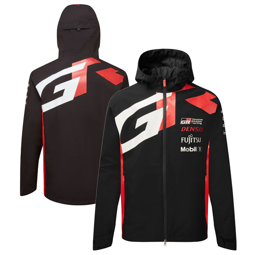 2025年WEC TGRチームのレインジャケットレプリカ。胸元に大きなGRロゴがデザインされ、スポンサーロゴは各所にプリントされています。