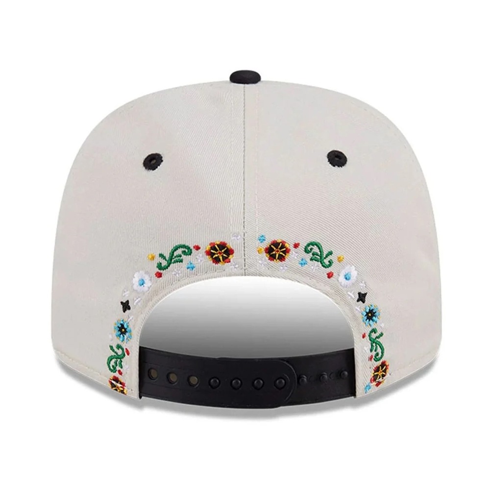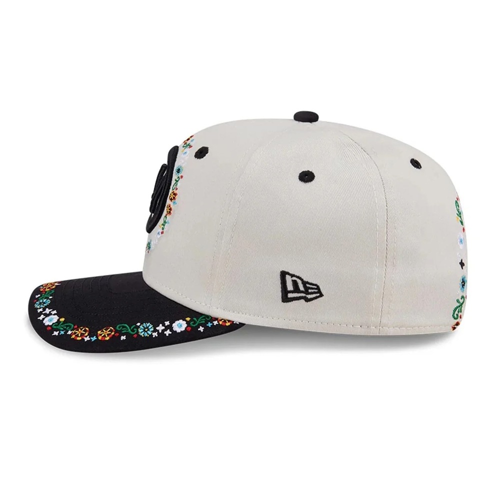 シンプルで使いやすいカラーのキャップに、メキシコをイメージする花柄刺繍が施されています。 前面のロゴ周り、バイザーの縁、後部のアーチ部分に広がるカラフルな花柄が、どこか温かみと活気を感じさせるデザインです。